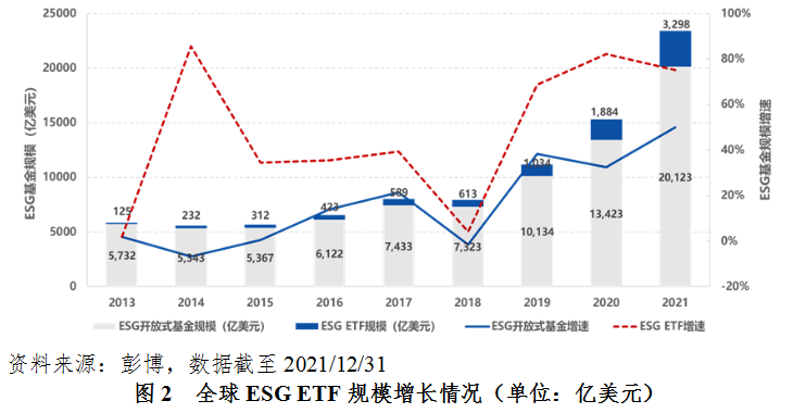 過(guò)去幾年ESG投資規??焖倥蛎?。全球可持續投資聯(lián)盟(GSIA)報告顯示,ESG整合策略取代負面剔除策略成為全球范圍內采用最多的投資策略。ESG ETF作為參與ESG投資重要工具,獲得投資者廣泛青睞。根據彭博數據統計,截至2021年底,全球ESG ETF資產(chǎn)規模達到3298億美元,同比增長(cháng)92%。歐洲仍是全球ESG ETF增長(cháng)引擎,2021年ETF市場(chǎng)超過(guò)50%的資金流入可持續投資領(lǐng)域。美國ESG ETF緊隨其后,在SmartBeta型ESG ETF中,2020年來(lái)新發(fā)產(chǎn)品數量占比近半。